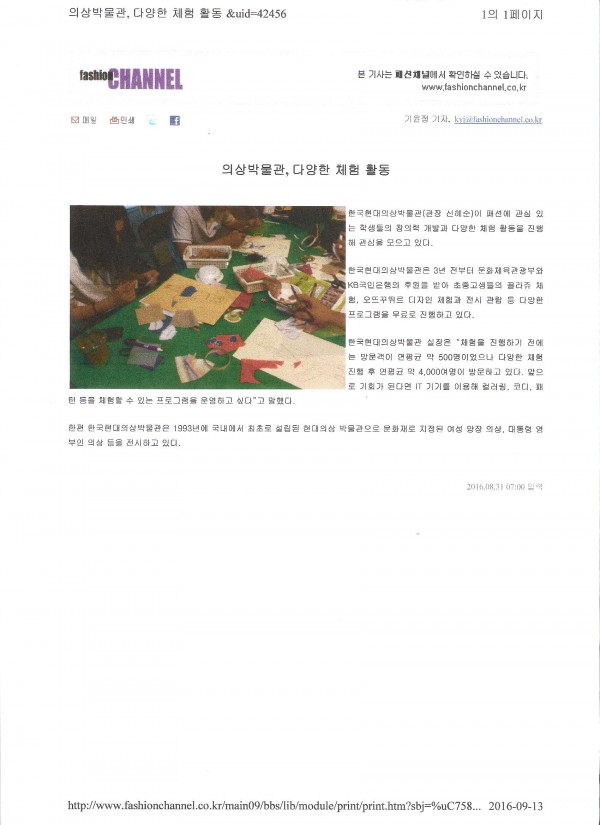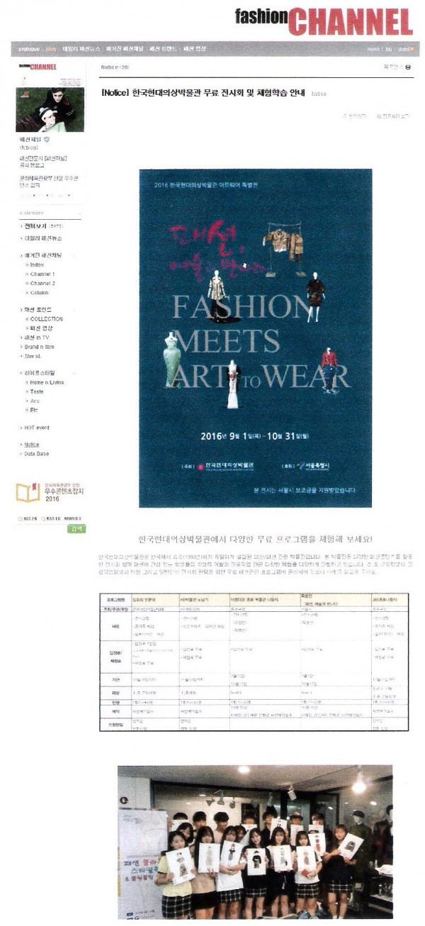 패션전문잡지인 "fashion CHAANNEL 패션채널" 8월호 홈페이지에 한국현대의상박물관에서 진행하는 다양한 체험프로그램과 전시에 관하여 소개되는 기사가 게재되었습니다.