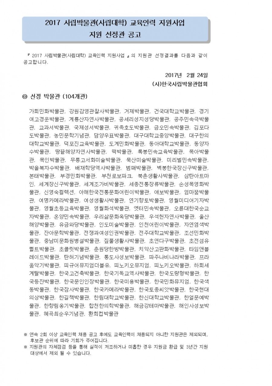 2017 사립박물관(사립대학) 교육인력 지원사업 지원 선정관 공고 페이지 정보 작성자 관리자 작성일17-02-24 19:58 조회41,991회 댓글0건 관련링크 이전글 다음글 목록 본문 댓글목록 등록된 댓글이 없습니다. 이전글 다음글 목록