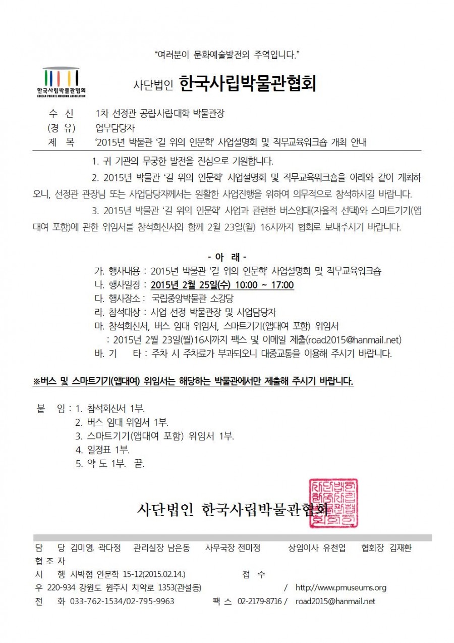 2015 박물관 ‘길 위의 인문학’ 사업설명회 및 직무교육워크숍 개최 안내 페이지 정보 작성자 관리자 작성일15-02-25 15:16 조회41,615회 댓글0건 관련링크 이전글 다음글 목록 본문 댓글목록 등록된 댓글이 없습니다. 이전글 다음글 목록