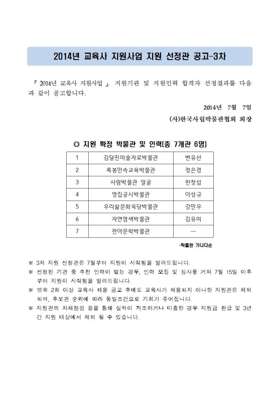 『 2014년 교육사 지원사업 』 지원기관 선정 공고 - 3차 페이지 정보 작성자 관리자 작성일14-07-07 14:29 조회40,123회 댓글0건 관련링크 이전글 다음글 목록 본문 댓글목록 등록된 댓글이 없습니다. 이전글 다음글 목록