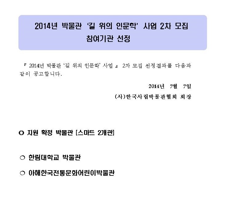 [인문학] 2014 박물관 길 위의 인문학 2차 기관모집 선정결과발표 페이지 정보 작성자 관리자 작성일14-07-07 14:30 조회40,024회 댓글0건 관련링크 이전글 다음글 목록 본문 댓글목록 등록된 댓글이 없습니다. 이전글 다음글 목록