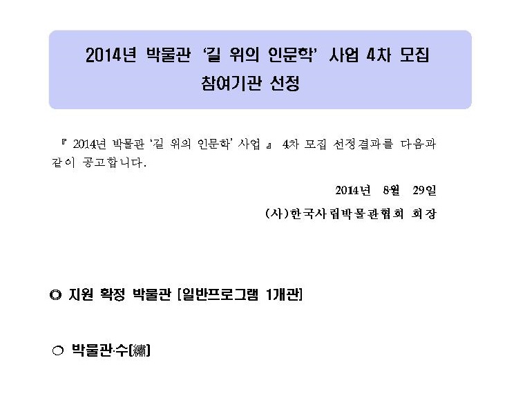 2014 박물관 길 위의 인문학 4차 기관모집 선정결과발표 페이지 정보 작성자 관리자 작성일14-08-29 14:33 조회40,105회 댓글0건 관련링크 이전글 다음글 목록 본문 댓글목록 등록된 댓글이 없습니다. 이전글 다음글 목록