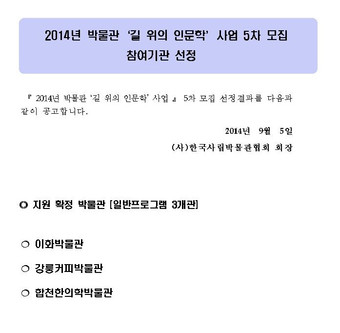 2014 박물관 길 위의 인문학 5차 기관모집 선정결과발표 페이지 정보 작성자 관리자 작성일14-09-05 14:34 조회40,406회 댓글0건 관련링크 이전글 다음글 목록 본문 댓글목록 등록된 댓글이 없습니다. 이전글 다음글 목록